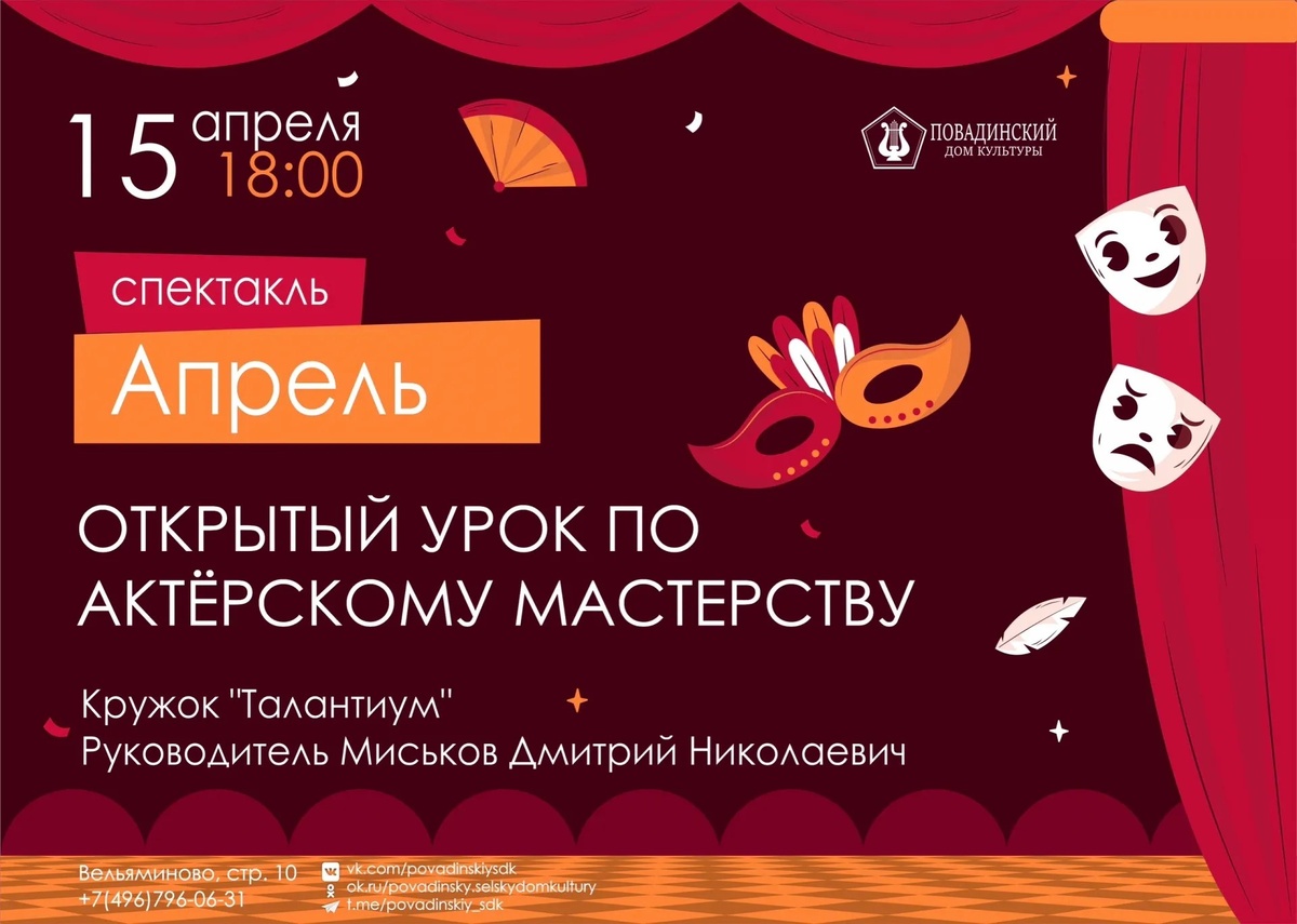 ✨ 🎭Приветствуем всех почитателей театрального искусства! И приглашаем вас на открытый урок по актерскому мастерству кружка «Талантиум». Обещаем незабываемые эмоции и приятные впечатления🎭 📆 15.04.2025🕒18:00 🏢 Повадинский сельский дом культуры (СДК) 📍 г.о.Домодедово, с.Вельяминово, 10, Центральная площадь ✅ Мероприятия Домодедово https://dzen.ru/id/66f10385cc4c5a16f7b5fb02 http://vk.com/domodedovo_events http://dzen.ru/domodedovo_events