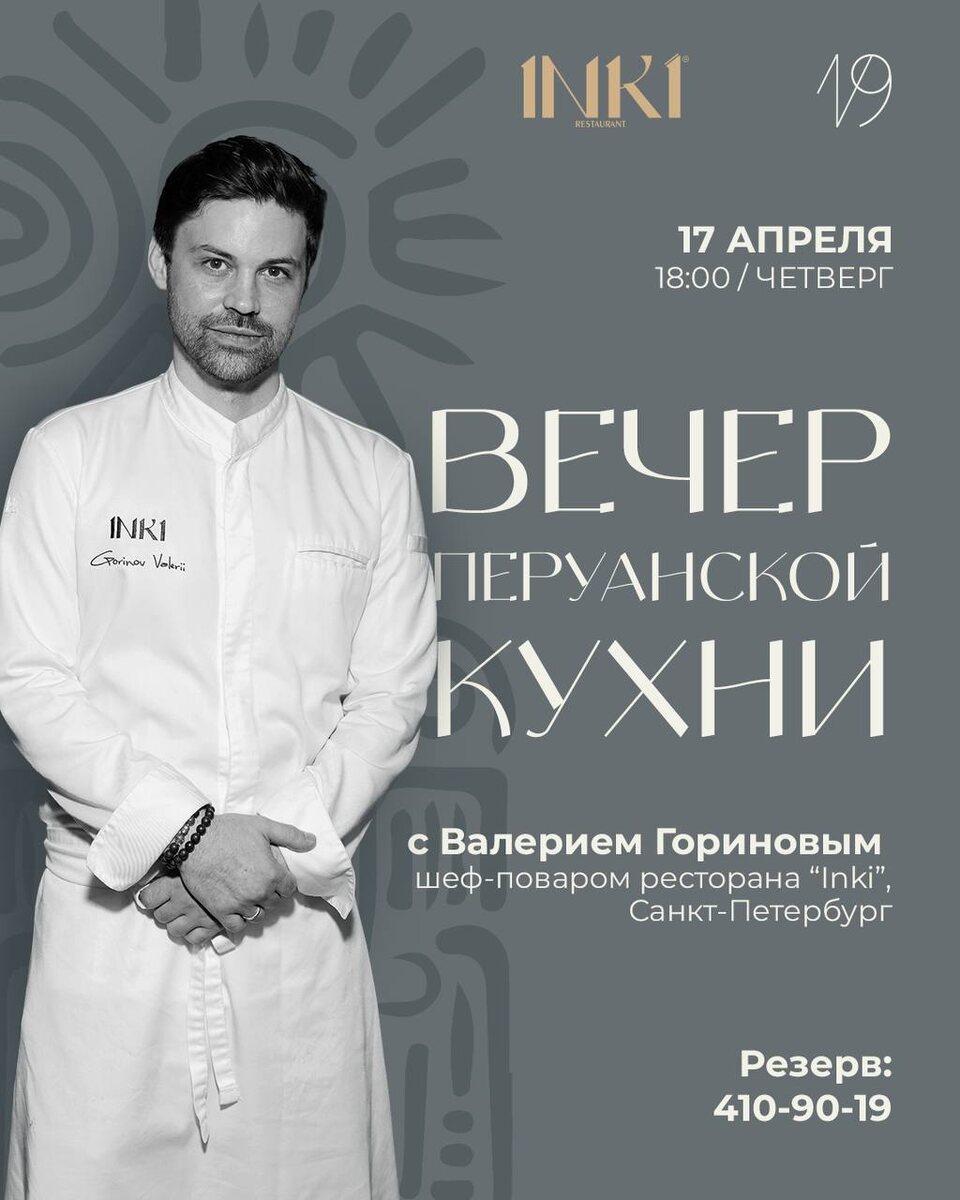 Вечер перуанской кухни в ресторане 19 Шеф-повар ресторана INKI (Санкт-Петербург) Валерий Горинов приготовит свои хиты: - Тыквенная бриошь с мраморной говядиной и вяленым гребешком; - Тирадито из опалённого лосося на углях с тигре амарильо и грейпфрутом; - Севиче из дикой дорады с тигре де лече и чипсами из чёрного риса; - Чёрная треска в мисо-маракуйя глазури с цветной капустой и лаймовым пакчой; - Томлёное говяжье ребро с корнем сельдерея и соусом с перцем андалиман; - Десерт «Золото инков» Ужин пройдет в формате a la carte, каждый гость сможет выбрать и заказать любое блюдо из предложенного меню. 17 апреля с 18.00 Ошарская, 8А #яместный