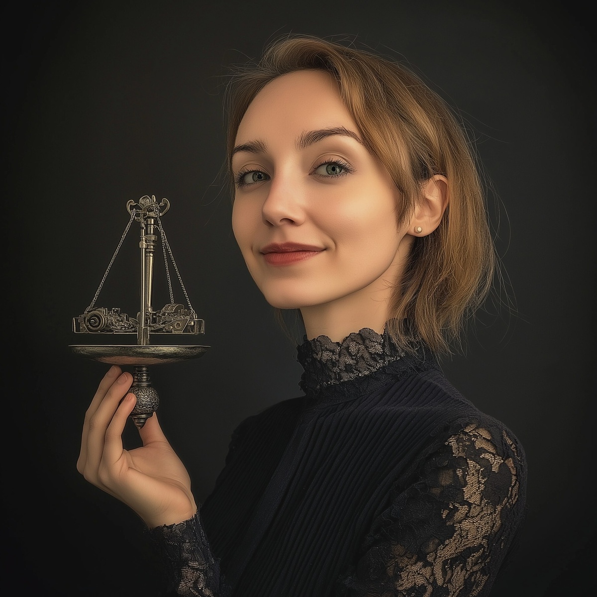 Создано на основе запроса: using her face and body, she balances a futuristic looking weighing scale at the palm of her hand