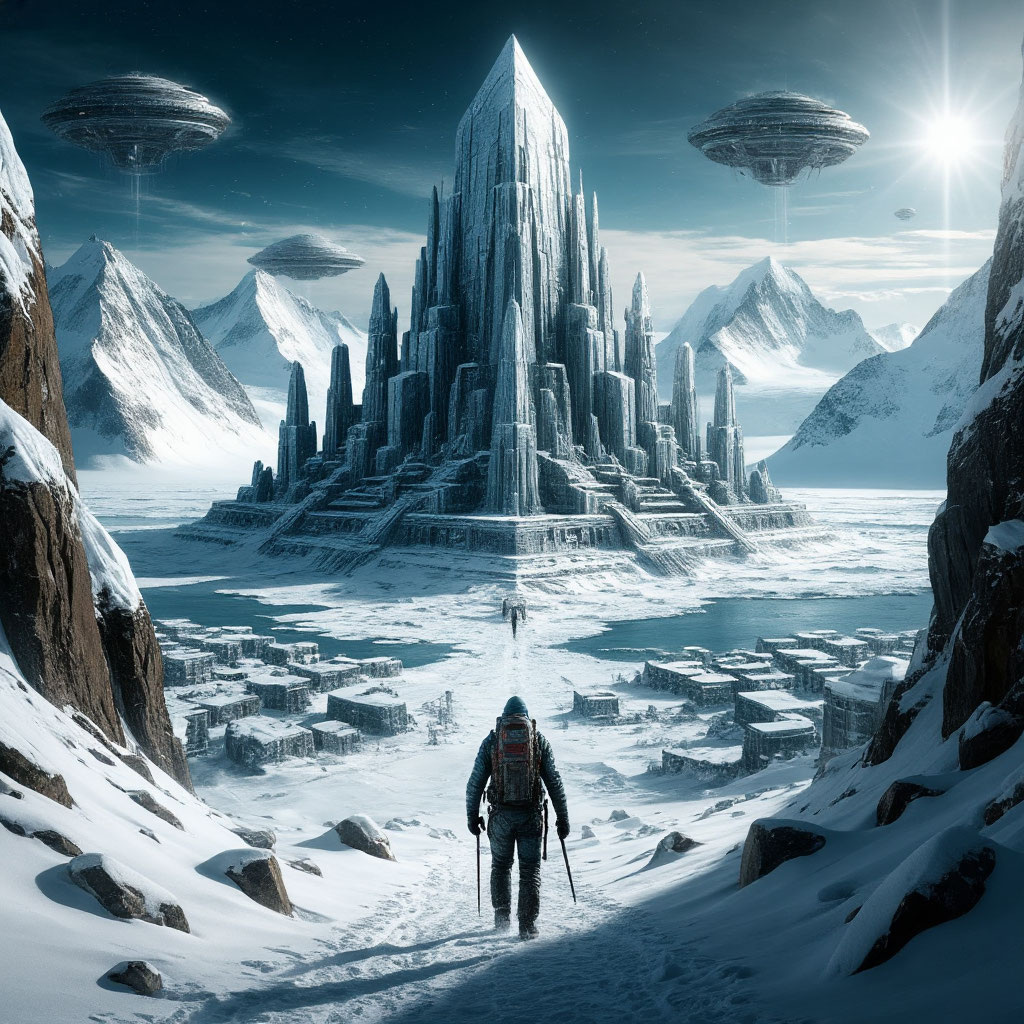 Спустившись, команда обнаружила мегаполис, покрытый инеем. Здания напоминали смесь техно-архитектуры и органических форм, словно они выросли. На стенах — фрески с существами в плащах, держащими сферы. Биолог Марк нашёл кости — человеческие, но с шестью пальцами. «Они эволюционировали иначе», — пробормотал он. Внезапно фонарики погасли, а вдалеке загорелись синие огни.