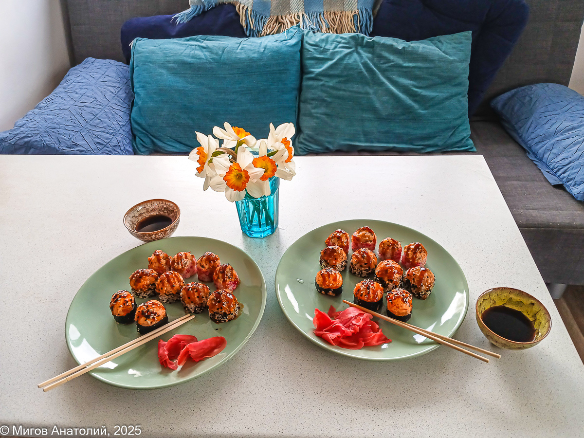 Неделю назад я рассказывал, что мы с Леной ездили в Феодосию, чтобы заказать керамическую плитку для нашего очередного ремонта, а заодно купить там вредной еды. И показал фотографию запеченных роллов. И тут же последовали комментарии от наших читателей: А почему роллы еда вредная?? (Александр Павлов) А почему роллы - это вредная еда? (Катя Б) А почему вредная еда? Рис, рыбка, тем более, термически обработанные? Вы же не ездите роллы постоянно? (Alla K.) Там ещё были подобные вопросы, так что придётся объясняться ) На самом деле я очень люблю всю эту восточную еду: роллы, суши, мисо-суп, том-ям и прочие сашими с удонами. Готов есть это хоть каждый день. В этом-то и заключается главная вредность - бьёт по итак не слишком толстому кошельку пенсионера. На заглавном фото - за две эти скромные порции запеченных роллов я отдал 1050 рублей. А тут только слегка размяться и раззадориться. Ну а так, чтобы получить не только удовольствие, но чувство сытости, уже надо заплатить не менее полутор