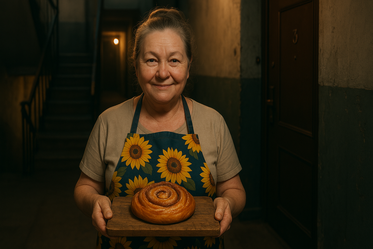 — Света. Без Петровны. Я же не в поликлинике. Она была невысокой, кругленькой, вечно в фартуке с подсолнухами, с руками, пахнущими мукой и ванилью. Волосы — всегда собраны в пучок, а глаза — тёплые, светлые, будто у неё внутри всё время горела лампа. Тётя Света появилась в доме лет десять назад. Купила квартиру и сразу начала печь. Как будто решила: раз здесь пахнет сыростью и батареи шипят по-осеннему — нужно срочно добавить в это место что-то настоящее. Каждое воскресенье из её квартиры начинало тянуть корицей, запечённым яблоком, сливочным маслом. Запах поднимался по лестнице, сворачивал в щели, заполнял ящики с почтой. Он был первым, что чувствовали жильцы, выходя из квартир. А потом начиналось самое важное. Она шла по этажам. Со старой деревянной доской в руках, на которой лежа