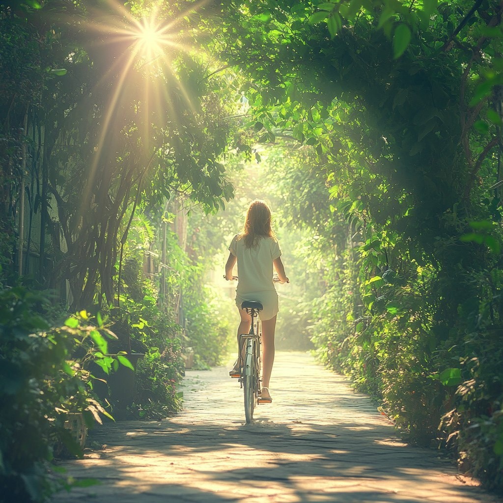 Создано на основе запроса: visually stunning very detailed photography of a lady making a trip on a bicycle outside the ci, lots of