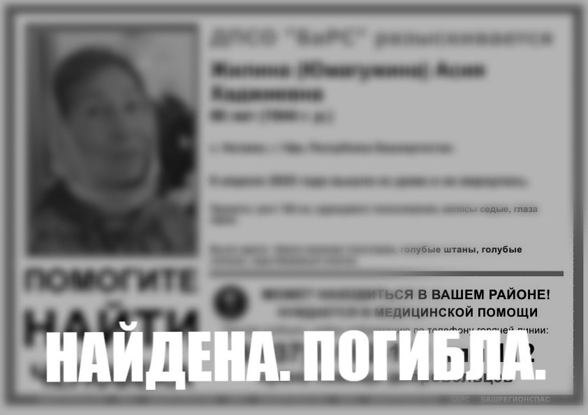 Поиски пропавшей 80-летней Асии Ж. закончились трагедией. Как сообщили сегодня добровольцы поискового отряда «Башрегионспас», женщину нашли мертвой. «Соболезнования родным и близким. Спасибо всем, кто принимал участие в поиске», — говорится в сообщении волонтеров. Пожилая женщина ушла из дома в Нагаево 8 апреля и не вернулась. В ее поисках были задействованы сотрудники полиции, волонтеры, родственники. К сожалению, пенсионерка погибла.