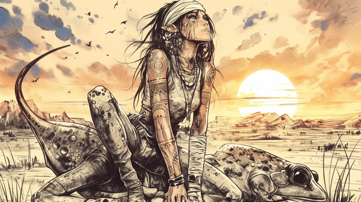 Создано на основе запроса: amphibian tribal rider, at sunset in Nibiru desert, distopic spaghetti western, moebius illustration style,