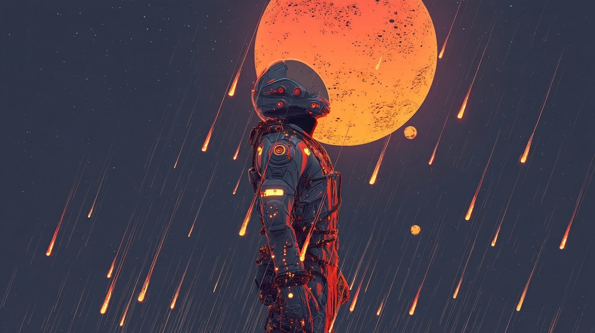 Создано на основе запроса: A surreal futuristic digital illustration of a cybernetic traveler standing in front of Mars, with meteors rainfall on the planet, the traveler wears a cybernetic suit with glowing elements to represent the future, a dark starry background, minimalist surrealism, sci-fi art style, dramatic lighting, glowing elements, poetic and mysterious atmosphere