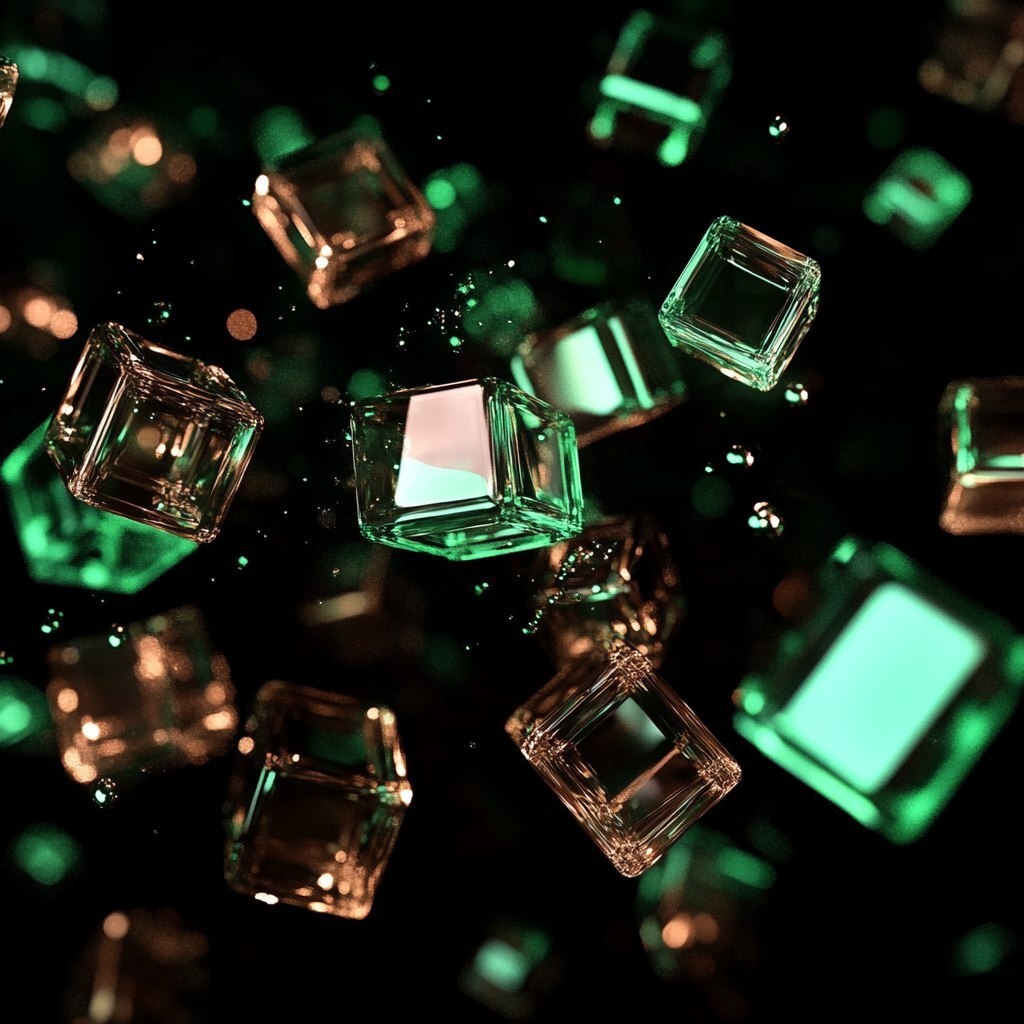 Создано на основе запроса: extremely detailed and realistic, total black background, 50 shining cubes, group of magic green shining cubes
