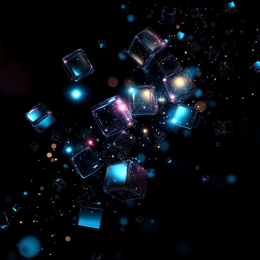 Создано на основе запроса: extremely detailed and realistic, total black background, 30 shining cubes, group of magic blue shining cubes, blue and brown shining