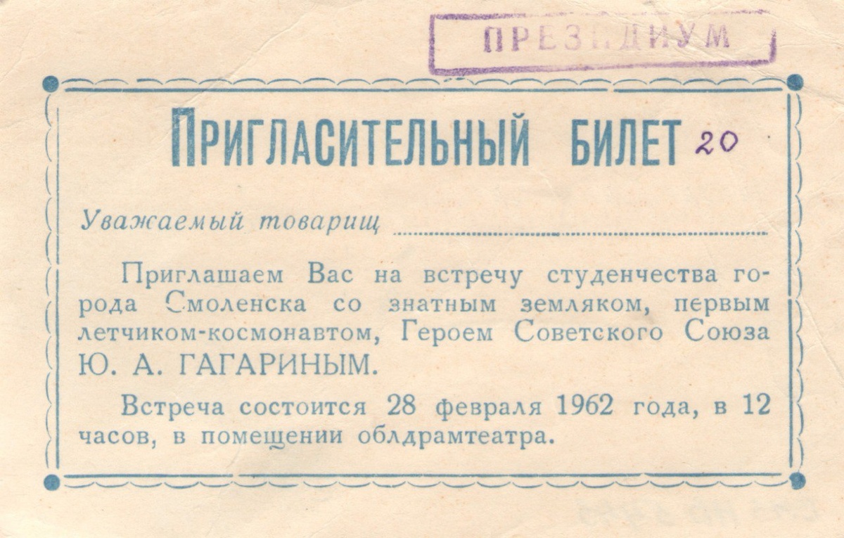 Собрали интересные факты о Юрии Гагарине, связанные со Смоленском и нашим университетом «Приглашаем Вас на встречу студенчества со знатным земляком, первым лётчиком-космонавтом, Героем Советского Союза Ю.А. Гагариным» Такие билеты в 1962 году получили студенты и преподаватели Смоленского пединститута. Это был первый приезд Юрия Гагарина на малую родину после полёта в космос. 28 февраля 1962 года в Смоленском драмтеатре Юрий Гагарин встретился со студенчеством. «Солнечный яркий день, деревья в пушистом инее, и радостные студенческие толпы, осаждающие драмтеатр, где должна произойти встреча с человеком, впервые шагнувшим в космос» Так писали о встрече с космонавтом в газете СГПИ от 3 марта 1962 года. Тогда Юрия Гагарина избрали почётным членом Учёного совета СГПИ и кафедры физики по специальности «Астронавтика». Это Постановление Учёного совета Смоленского педагогического Института им. Карла Маркса о занесении Гагарина в Книгу Почёта института Летом 1962 года студенты историко-филологич