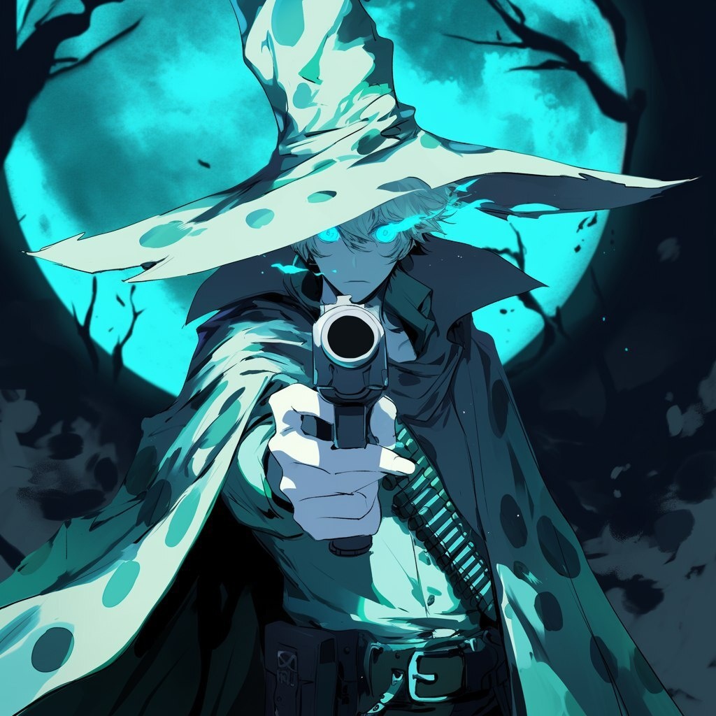 Создано на основе запроса: young male, glowing blue eyes, wearing a large white witches hat, wearing a green cloak with dark green spots on it, black clothes underneath, holding a pistol in his hands, standing in a dark forest, a large blue moon shining bright in the background