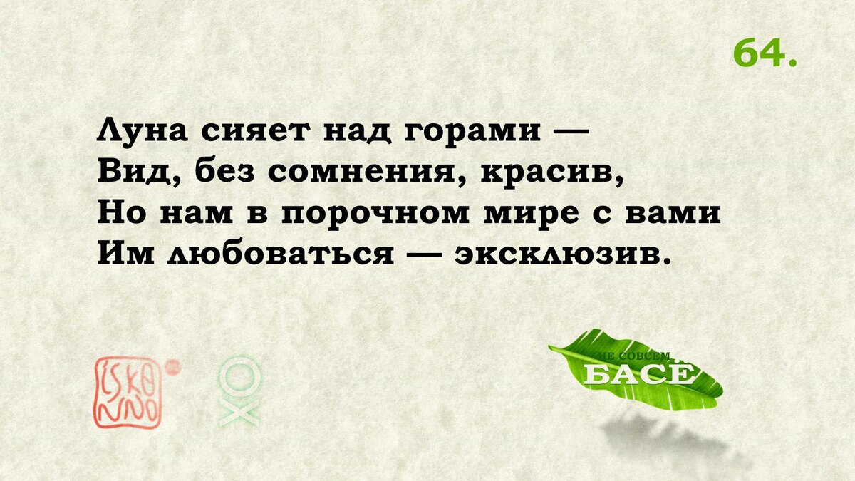 Им любоваться — эксклюзив. Еще одно стихотворение, сводящее город Эдо с неназываемым не-Эдо (очевидно, с Игой, родиной Басё). Открывается словом [нагамуру] — «любоваться», а возможно что и «слагать стихи». Вторая строка: «в Эдо редкость (диковинка)». И завершающая строка: [яма-но цуки], буквально «горная луна». На удивление простой прямой и последовательный смысл: «В Эдо редкий случай, {когда можно} полюбоваться {и сложить стихи} о луне над горами». В исторической части Токио (в отличие от Иги) действительно сложно с горными видами, а во времена Басё население Эдо если и не превышало миллион, то вплотную подбиралось к нему, так что дым очагов явно мешал астрономическим наблюдениям. Всё гладко и понятно, но где большое поэтическое событие? Да, есть неоднозначность слова, правда, не меняющее сути, есть подразумеваемое сравнение с неназванным регионом, но хочется чего-т