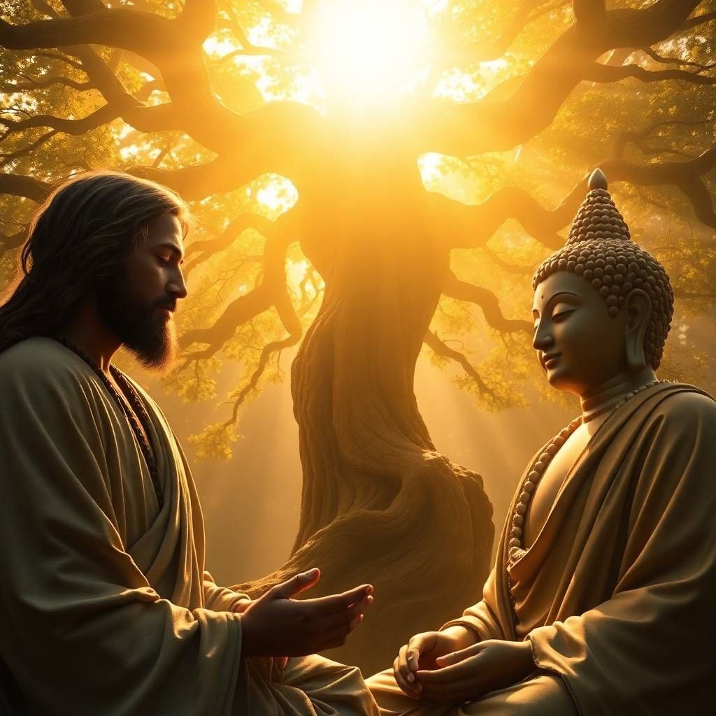 Будда: (с лёгкой улыбкой) Иисус, я родился принцем в царстве Шакьев, но отказался от трона, увидев страдания мира — старость, болезнь, смерть. Я ушёл в лес, медитировал, искал истину. Под деревом Бодхи я достиг просветления и стал учить Четырём Благородным Истинам. Мои последователи собирались в рощах, мы сидели на земле, и я говорил о пути к нирване. А как ты, Иисус, жил среди своего народа?