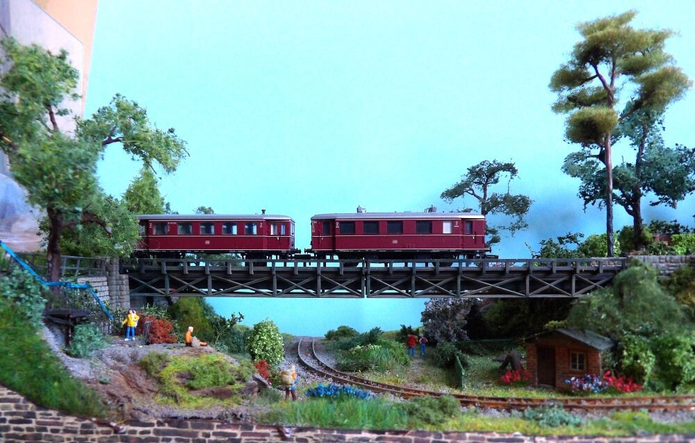Работа над модулем идет, хотя не так быстро, как я предполагал. Но наступил тот день, когда почти всё сделано и надо посмотреть как макет будет выглядеть в работе. Сегодня у меня был "примерочный день" - я поставил подвижной состав и сделал несколько приценочных снимков. Итак, вид на мост, который я хотел получить. На скале у меня сел турист/паломник и любуется на мост и "природу". И проход туристов по тропе под мостом (для ориентирования - высота фигурки человека 10-12мм): С одной стороны я запылил пастелью мост и пластик перестал предательски блестеть. А вот церковь получилась темноватой - придется ее немного осветлить: По узкоколейке пока у меня ходит паровоз типоразмером меньше (масштаб 1:220, а не 1:160 как у меня сделан весь макет). Однако на фотографии этого почти незаметно. Наверное, поэтому узкоколейка с колеей в 6,5 мм не слишком популярна - визуально различий почти нет. Проход паровоза узкоколейки под мостом: Хотя, если смотреть вдоль рельс, то разница всё-таки видна: Вид на
