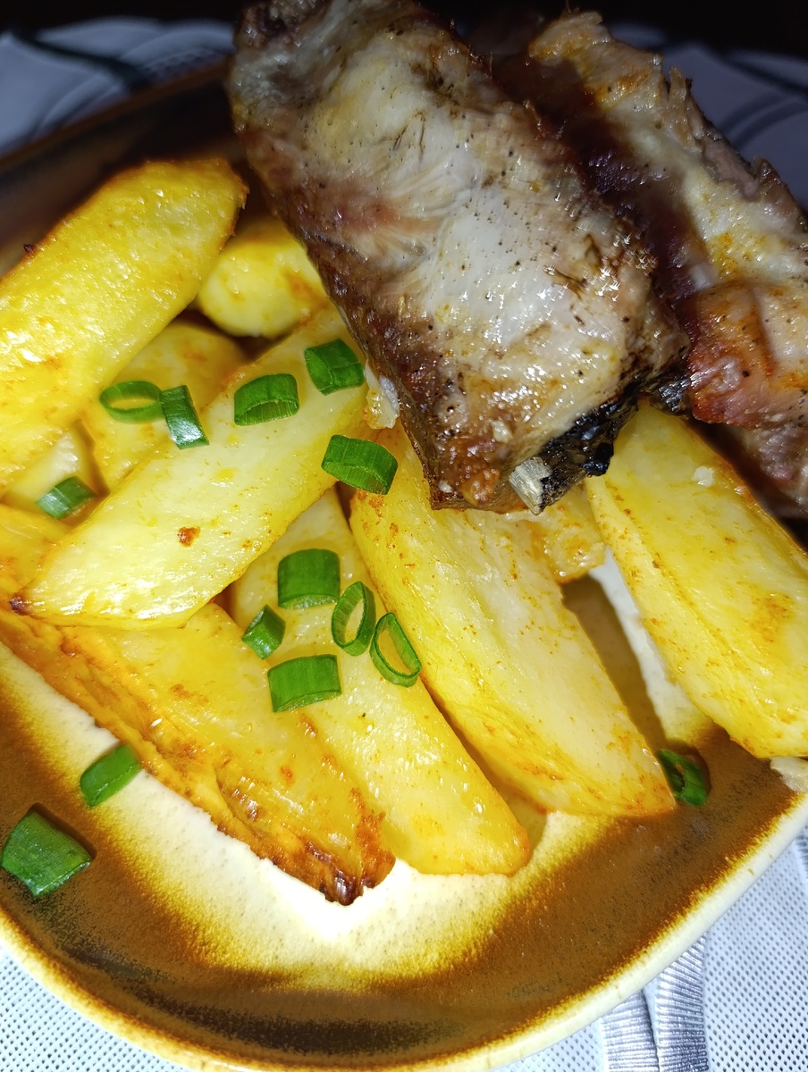 Ингредиенты: ребрышки - 1,5 кг картофель 1,5 кг паприка - 1 ч л гранулированный чеснок - 1 ч л перец черный молотый - 0,5 ч л соль - 2 ч л растительное масло Ребрышки моем и нарезаем по одному-два ребрышка. Добавляем перец, соль 1 ч л., немного растительного масла. Перемешиваем. Картофель очищаем, нарезаем дольками. Смешиваем с паприкой, чесноком и 1 ч л соли. Добавляем немного растительного масла. Выкладываем на противень ряд ребрышек, ряд картофеля. Запекаем при 165 градусах 1 час 15 минут. Приятного аппетита!!!!!