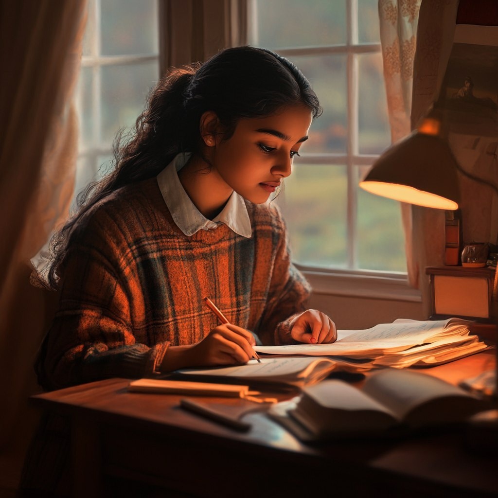 Создано на основе запроса: "a 15-year-old girl of Indian descent, studying in her bedroom, focused expression, books and notebooks spread on a desk, soft warm lighting, cozy and personal room decor, gentle natural light from a window, peaceful atmosphere, ultra-realistic, cinematic style