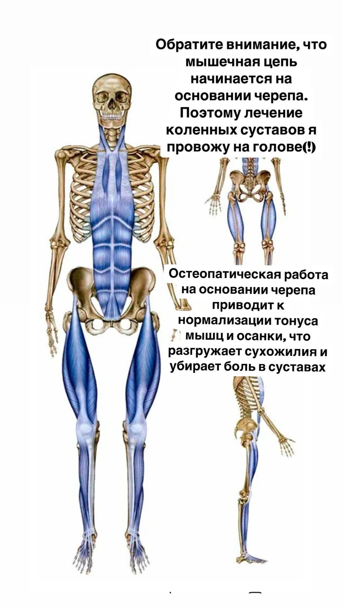 Болит колено (колени). Всегда ли причина гонартроз? (Кейс из практики) Боль в коленных суставах может быть мышечной, т.н. функциональной, например, если перегружены мощные 4-х главые мышцы бедра. На этой неделе было два таких пациента. У обеих в анамнезе многолетние боли в коленных суставах, которые усиливаются при движении. На МРТ в суставах нет никаких серьезных нарушений, которые бы давали такую клинику. Лечились примерно одинаково - прием НПВС, массаж и уколы в сустав. Пили хондропротекторы. С переменным успехом что-то помогало на время. Однако причина была не выявлена. Да и диагноз не поставлен. И в обеих случаях причина была не в коленных суставах, а в перегрузке мышц бедра, которые своими сухожилиями вплетаются в надкостницу и надколенник в области суставов. Они то и болели! Но это лишь вершина айсберга, а основа - постуральный дисбаланс. И где бы вы думали? Прикус. Череп. Я не стоматолог, но на приеме зубы и прикус смотрю всем. И уж если есть нарушения, обязател