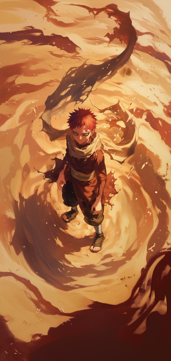 Создано на основе запроса: Gaara standing on sand waterfall , Naruto Shippuden anime style, floating gourd with rune seals, hyperdetailed