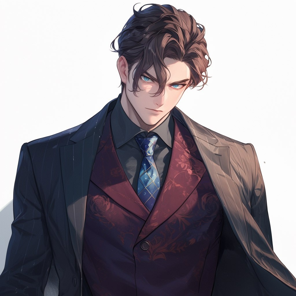 Создано на основе запроса: A guy in a beautiful patterned suit, brick brown hair and warm gray eyes, full body