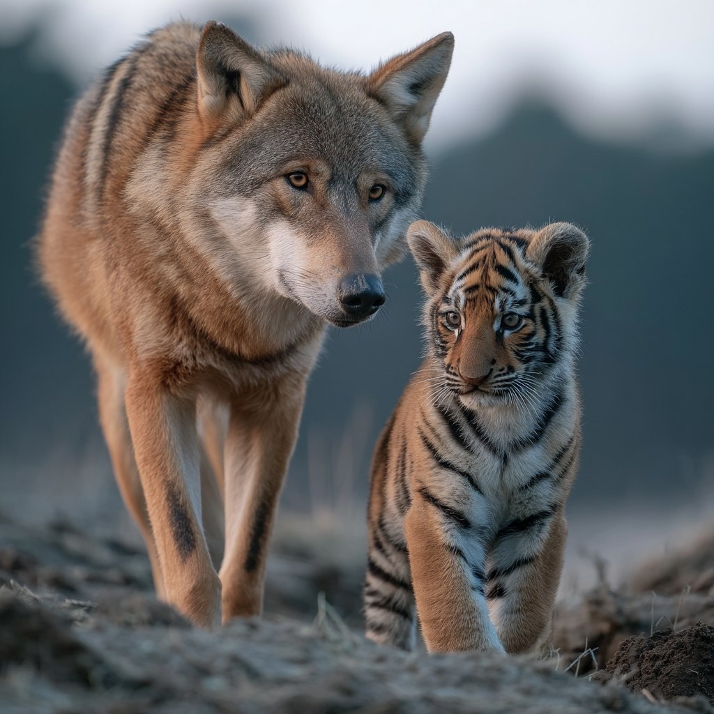 Создано на основе запроса: A red wolf and a tiger cub journey through the nibiru