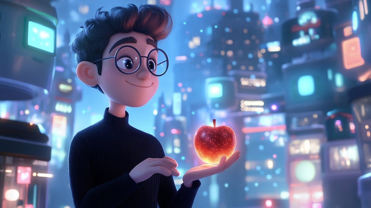 Создано на основе запроса: cartoon background of a friendly man with round glasses and black sweater, holding a glowing apple, standing in a