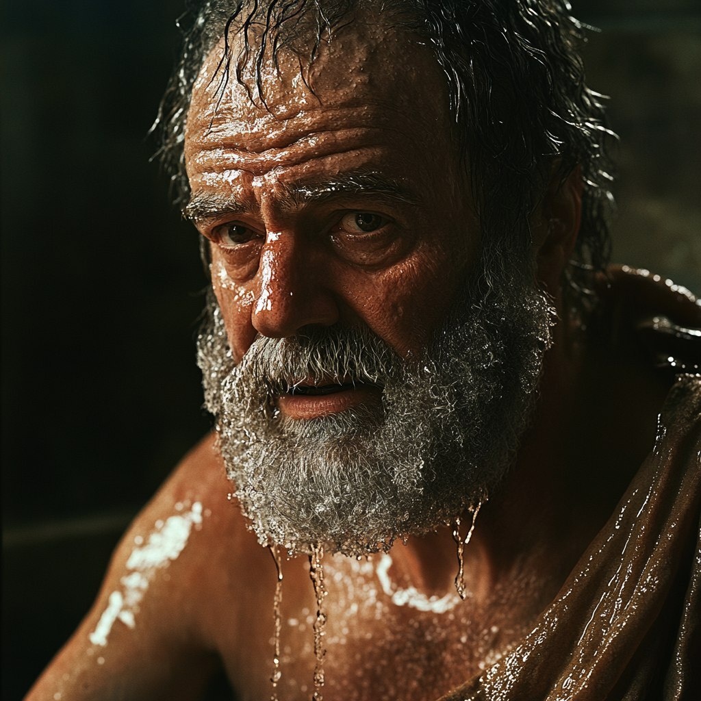 Создано на основе запроса: middle-aged Socrates, soaking wet from being splashed with water, sitting calmly with a wise yet humorous smirk, dripping hair and wet toga, dramatic lighting, cinematic close-up on his face, eyes slightly raised as if delivering a witty line, background hints of an ancient Greek home, comedic yet philosophical atmosphere, expressive and ironic tone --- Автоперевод: Сократ среднего возраста, впитываясь от того, что его брызгали водой, спокойно сидя с мудрой, но юмористической ухмылкой, капающими волосами и мокрой тогой, драматическим освещением, кинематографическим крупным планом на его лице, глаза слегка подняты, как будто поставляя остроумную линию, фоновые намеки древнегреческого дома, комедическая философская атмосфера, выразительная и ироническая тон. Какое твое мнение? 🤔 https://dzen.ru/id/65c0c65c86e4f837c27b24d7 #ИИ #AI #нейросеть #midjourney #art