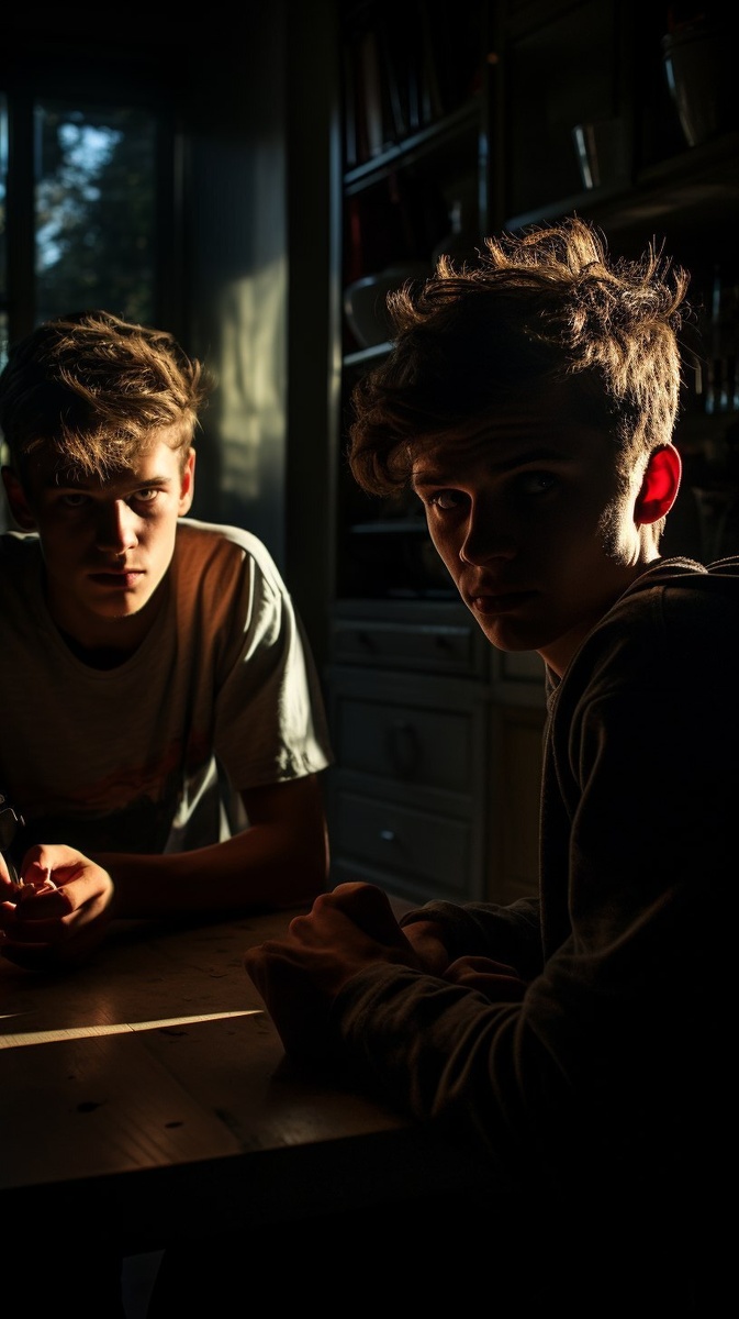 Создано на основе запроса: two teenage brothers in the same house ignoring each other, emotional silence, cold tension, dramatic light and shadow contrast