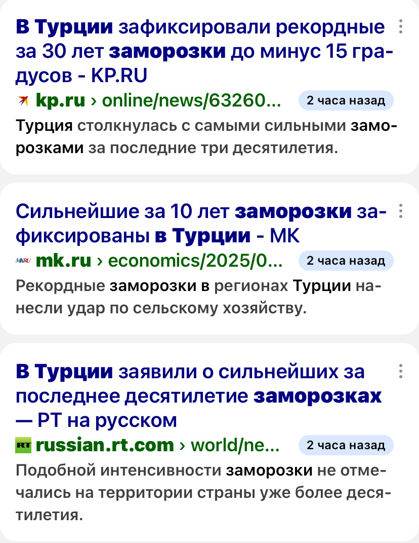Сильнейшие за последние 30 лет! Вся наша пресса, начиная с РБК, сегодня сообщила об этом. Привет, с Вами Елена. Хочу с Вами поделиться свежей информацией: Заморозки до -15 в выходные случились в провинциях Мерсин, Адана, Хатай. Это юг страны, Уважаемый Читатель! Замёрзло все, что к этому время вылезло из земли. Картофельные и луковые поля покрылись снегом. Виноградники! Жаль, но виноград померз очень. Также, как и ореховые деревья. В Малатье замёрзло 80% абрикосовых и персиковых деревьев. Абрикосов и персиков не будет. Вчера ехала по дороге Аланья - Анталья, справа-слева бесконечные парники Серика, и там активно краснеет клубника. Клубничная столица Анталийского побережья вовсю выдает сладкие ягоды. Оливковые посадки, приличные такие деревья, их красивый зеленый цвет ни с чем не спутаешь. Они все не пострадали! Где люди мерзли? -2-4 вечером и ночью! Низкие температуры зафиксировали в столице страны Анкаре в субботу-воскресенье, и все сразу нарядились в пуховики и шапки. Урон еще не по