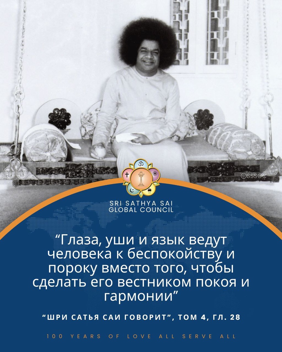 Вдохновение от Саи “Глаза, уши и язык ведут человека к беспокойству и пороку вместо того, чтобы сделать его вестником покоя и гармонии”. Шри Сатья Саи говорит, том 4, гл. 28