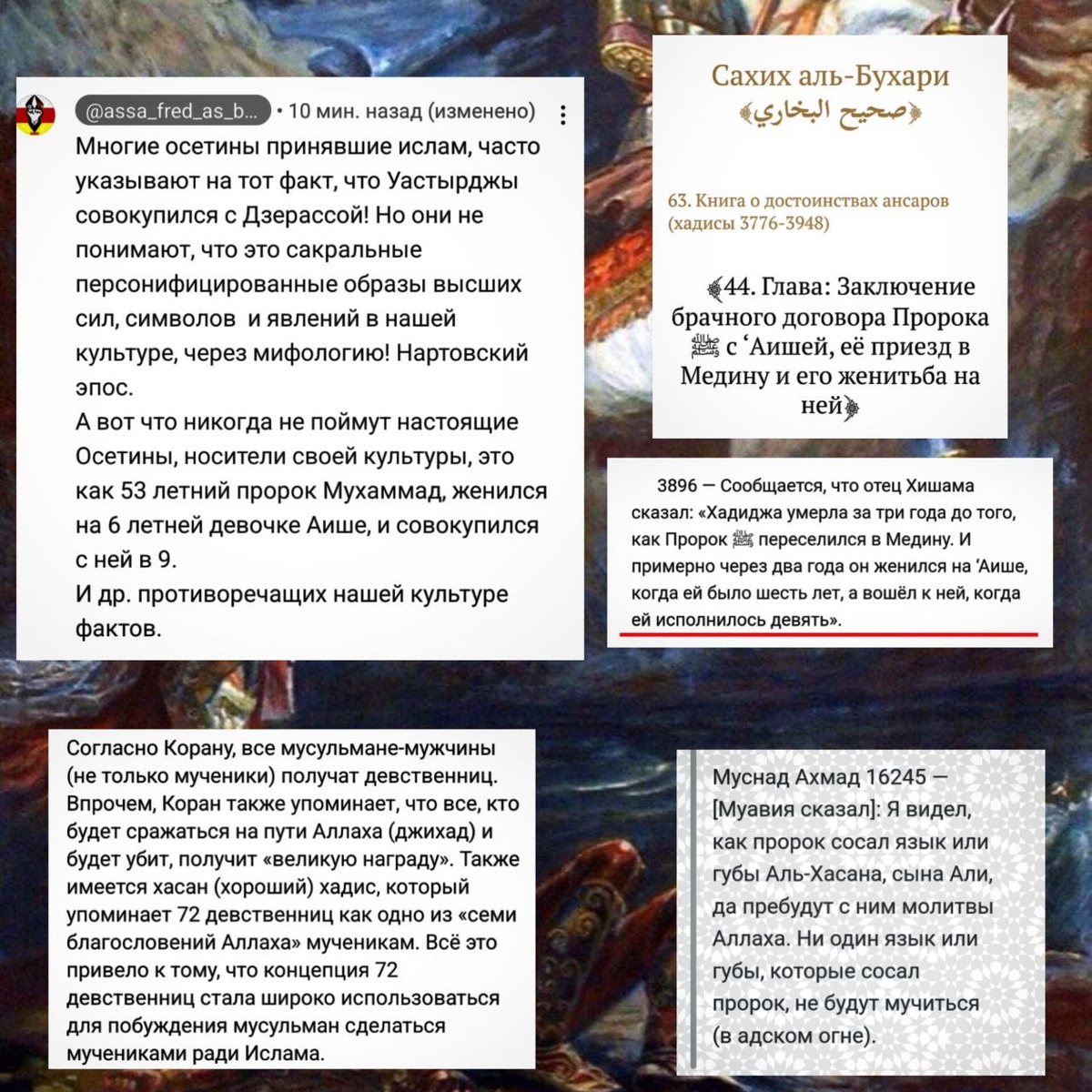 А вот что никогда не поймут настоящие Осетины, носители своей культуры, это как 53 летний пророк Мухаммад, женился на 6 летней девочке Аише, и совокупился с ней в 9.