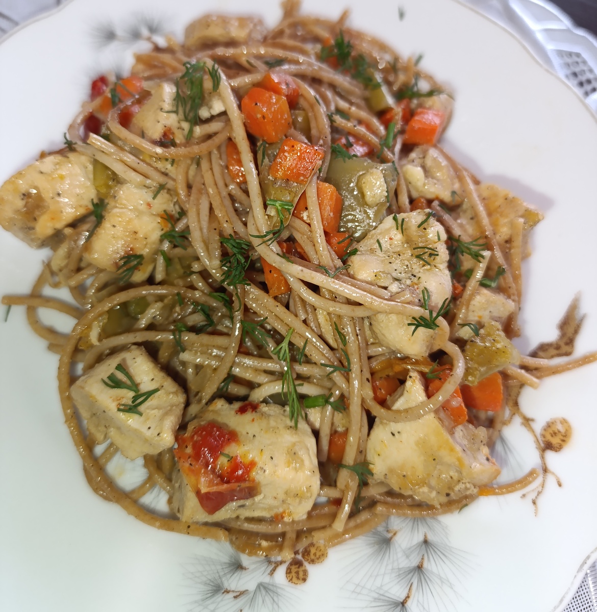 Ингредиенты: куриная грудка - 500 гр морковь - 100 гр перец болгарский - 1 шт гречневые спагетти - одна треть пачки перец - 0,25 ч л соль - 1 ч л Нарезаем курицу кубиками и слегка обжариваем. Морковь нарезаем кубиками и обжариваем вместе с курицей. Нарезаем перец кубиками. Я взяла горсть замороженного перца (заготовила еще летом). Обжариваем. Наливаем 500 мл воды, добавляем соль и перец. Как только вода закипит, сверху выкладываем спагетти, переломанные пополам (для удобства). Закрываем крышкой и варим иногда помешивая. Как только жидкость выкипит, блюдо готово. Это около 25 минут. Приятного аппетита!!!!