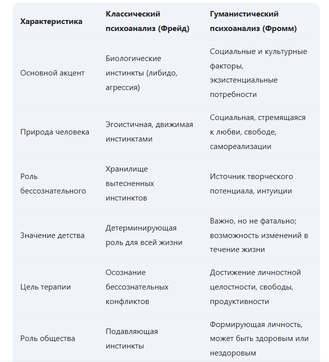 Эрих Фромм (1900-1980) – выдающийся немецкий психоаналитик, социолог, философ и гуманист. Он является одним из основателей гуманистического психоанализа, который представляет собой синтез классического психоанализа Фрейда и идей гуманистической психологии, социологии и философии. Фромм стремился преодолеть биологический детерминизм Фрейда, акцентируя внимание на социальных и культурных факторах, влияющих на формирование личности и ее психологические проблемы. Основные положения гуманистического психоанализа Фромма: Основные отличия гуманистического психоанализа Фромма от классического психоанализа Фрейда: Вклад Фромма в психологию и социологию: Ключевые работы Эриха Фромма: Заключение: Гуманистический психоанализ Эриха Фромма – это ценный вклад в понимание человеческой природы и ее взаимосвязи с обществом. Его идеи остаются актуальными и сегодня, предлагая пути к созданию более гуманного и справедливого мира. Фромм призывает к осознанности, ответственности и активной борьбе за свободу