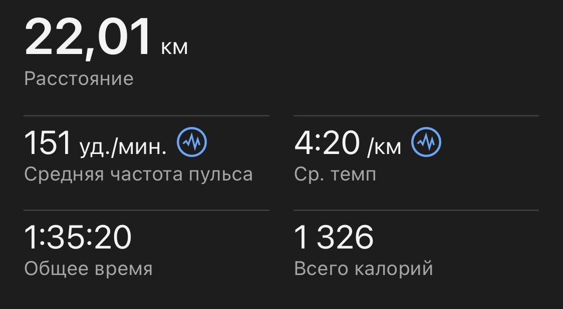 Подошла к окончанию восьмая неделя моей подготовки с нуля. Сегодня отбегал 22 км по 4.20. Это моя первая длительная тренировка дальше 20 километров за последние месяцы. Погода сегодня была не совсем беговая. На протяжении практически всех километров был ветер и постоянный дождь, но выбора не оставалось так как был уже вечер… Сделаем заметку, что отметка в полумарафон была пройдена за 1:31.29. Пусть это будет мой новый ориентир на будущее, хоть и в виде кросса а не старта. Организм после укладки тротуарной плитки загружен прилично. Даже сидеть на пятой точке чувствительно, не говоря уже о беге. В любом случае тренировкой остался доволен, так как даже на такое состояние средний темп был приличный, а пульс в районе 151 удара. Как итог эта неделя оказалась самой объемной за все восемь недели и составила 96 километров. Уже не так стыдно за себя. Напомню, что мои максимальные недельные объемы в пике всегда были в районе 120-130 километров и этого мне хватало бежать прилично быстро и пр