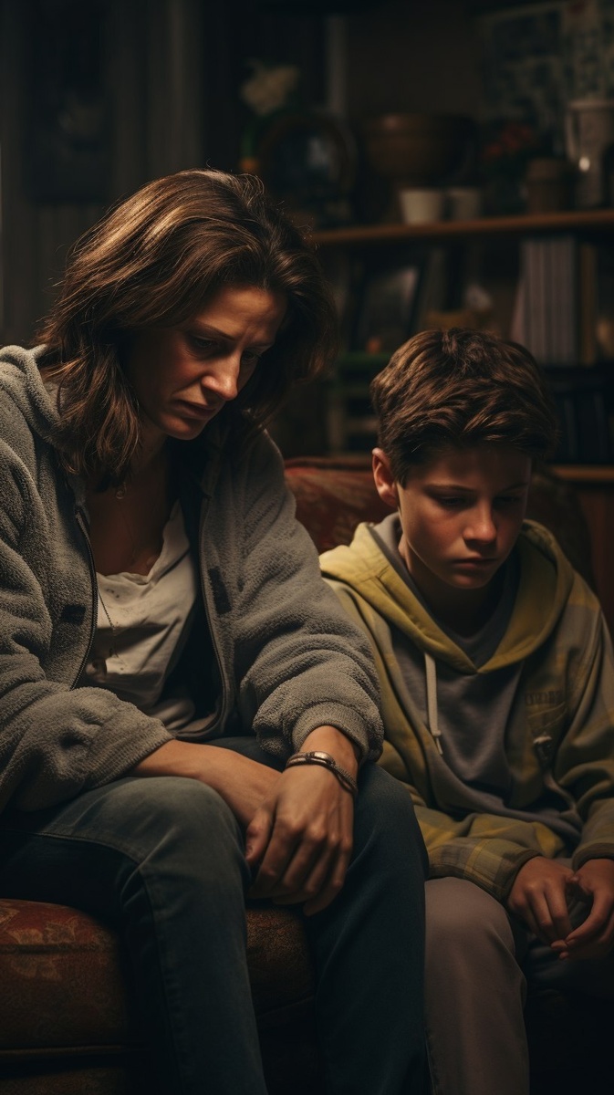 Автоперевод: Взрослый мальчик, сидящий со своей матерью в тихой гостиной, спрашивая о шраме на лице, эмоциональной атмосфере, теплом свете, мягком фокусе, кинематографическом реализме