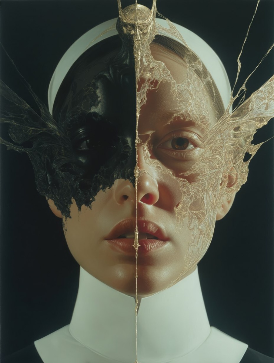 Создано на основе запроса: Symmetrical portrait of a woman split between hyperreal anatomy and expressionist abstraction