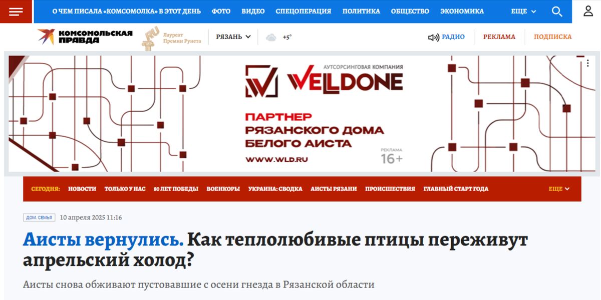 Рязанская Комсомолка после более чем полугодового молчания вновь решила вернуться к аистиной теме. На этот раз – в честь прилета рязанских аистов с зимовки. Если вы думаете, что за прошедшие годы журналисты чему-то научились, то, к сожалению, ошибаетесь. В новой публикации продолжается традиция прошлых лет. Такое впечатление, что основной задачей пресс-центра РДБА уже давно является дезинформация читателей.