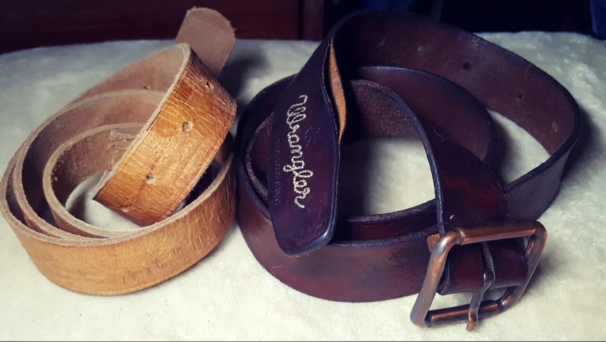 📜Итак, мы имеем кожаный ремень фирмы Wrangler в очень плохом состоянии. На фото он справа. Не подделка - приобретен в фирменном магазине задорого. Служил он долго - около 10 лет. Нас неприятно удивило, что ремень не из цельной полосы кожи, а склеенный. Что делать, видимо, это снижение себестоимости прибыли ради, т.к. капитализм на дворе😏 И нет- сами мы так не делаем, наши ремни всегда из толстой ременной натуральной кожи.