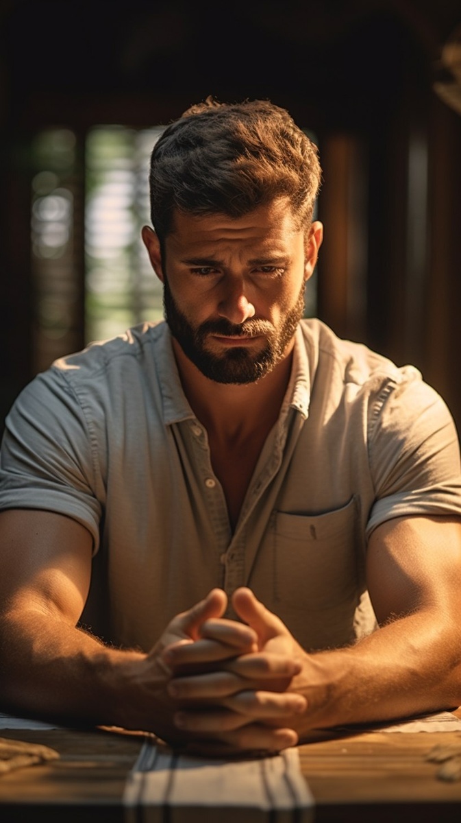 Создано на основе запроса: man praying quietly at home with worry on his face, thinking about his sick brother but not going to visit, peaceful emotional environment, cinematic shadows