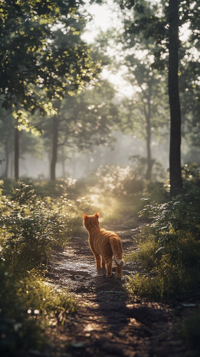 Создано на основе запроса: a photorealistic anthropomorphic orange tabby cat walking alone through a quiet forest path in the early morning, mist in the air, gentle sunlight filtering through trees, calm and emotional mood, cinematic