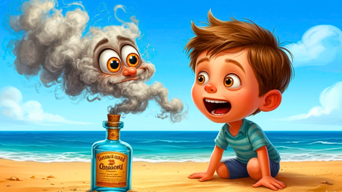 Жил-был у самого синего моря мальчик, по имени Колька. Маленький, но с любопытством, которое могло бы осушить целый океан. Каждое утро он выбегал на берег с удочкой и ведёрком, будто не рыбу ловить шёл, а сокровища искать. И ведь действительно — для него каждая ракушка была загадкой, каждая щепка — парусом воображаемого корабля. В тот день, море было особенно тихим. Ни волн, ни ветра — как будто сама природа затаила дыхание. — Хм, странно... Даже чайки молчат, — пробормотал Колька, забросив удочку с наживкой. Он сидел на камушке и ждал. Вдруг взгляд его упал на что-то, перекатившееся по песку. — Бутылка? Да ещё какая старая! — Он подбежал к ней, поднял находку и удивлённо присвистнул. Это была древняя бутылка из толстого, мутного стекла, запечатанная деревянной пробкой, да так плотно, будто сама судьба закрутила её. Что-то в ней переливалось. Не вода. И не песок. — А ну-ка... — с интересом сказал Колька и осторожно но с усилием, вытащил пробку. ШШШХХХ!!! Сразу вырвался туман — чёрный,