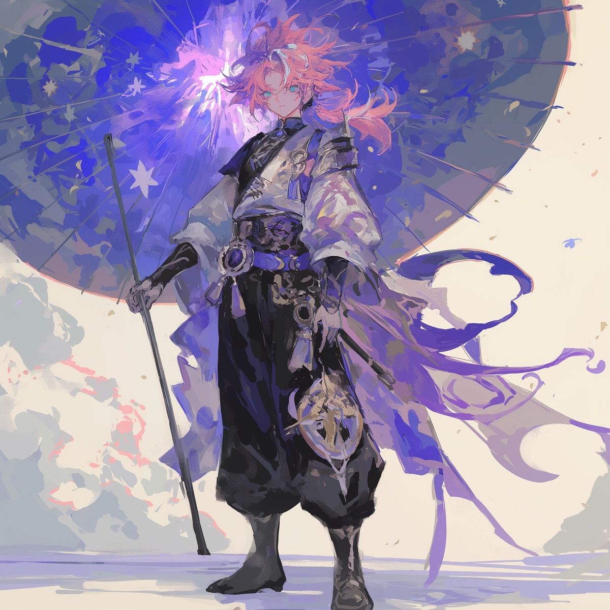 Создано на основе запроса: A guy in the style of Genshin Impact stands at full height in a beautiful suit with patterns, cosmic pink hair