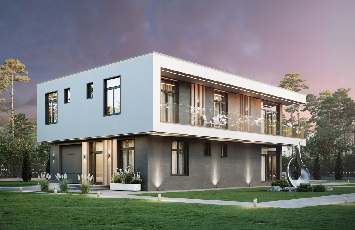 Такой проект двухэтажного дома с плоской крышей, панорамными окнами и большой террасой на втором этаже предлагает идеальное сочетание современного стиля, функциональности и тесной связи с природой, обеспечивая комфортное и приятное проживание для всей семьи.