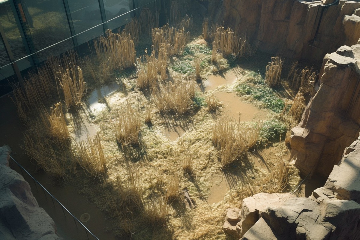 Создано на основе запроса: Bird's-eye view, top-down view, A short clip of the animal kingdom exhibit at a spacious, interactive, and educational eco-park in New York City. The scene shows an empty, waterless, desert-like area with dry, yellowed grasses on rocks and small sand piles on the ground, Many reeds have grown on the soil, A large, wide glass tank, filled to the top edge, is visible from the side view, containing a tiny forest made up of sparse green plants and brown moss growing around rock formations, all set against a blue sky backdrop. No animals or birds are seen.