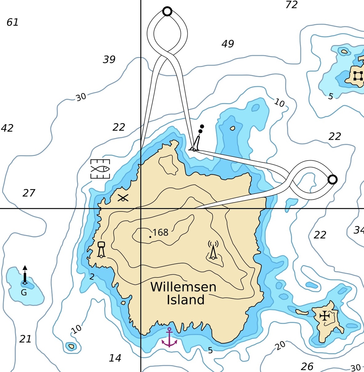 - Значение, например 3_5 (5 ниже половины высоты цифры 3), указывает, что в данной точке глубина составляет 3,5 метра относительно минимального астрономического прилива (LAT) — именно он чаще всего и используется как уровень Chart Datum.
