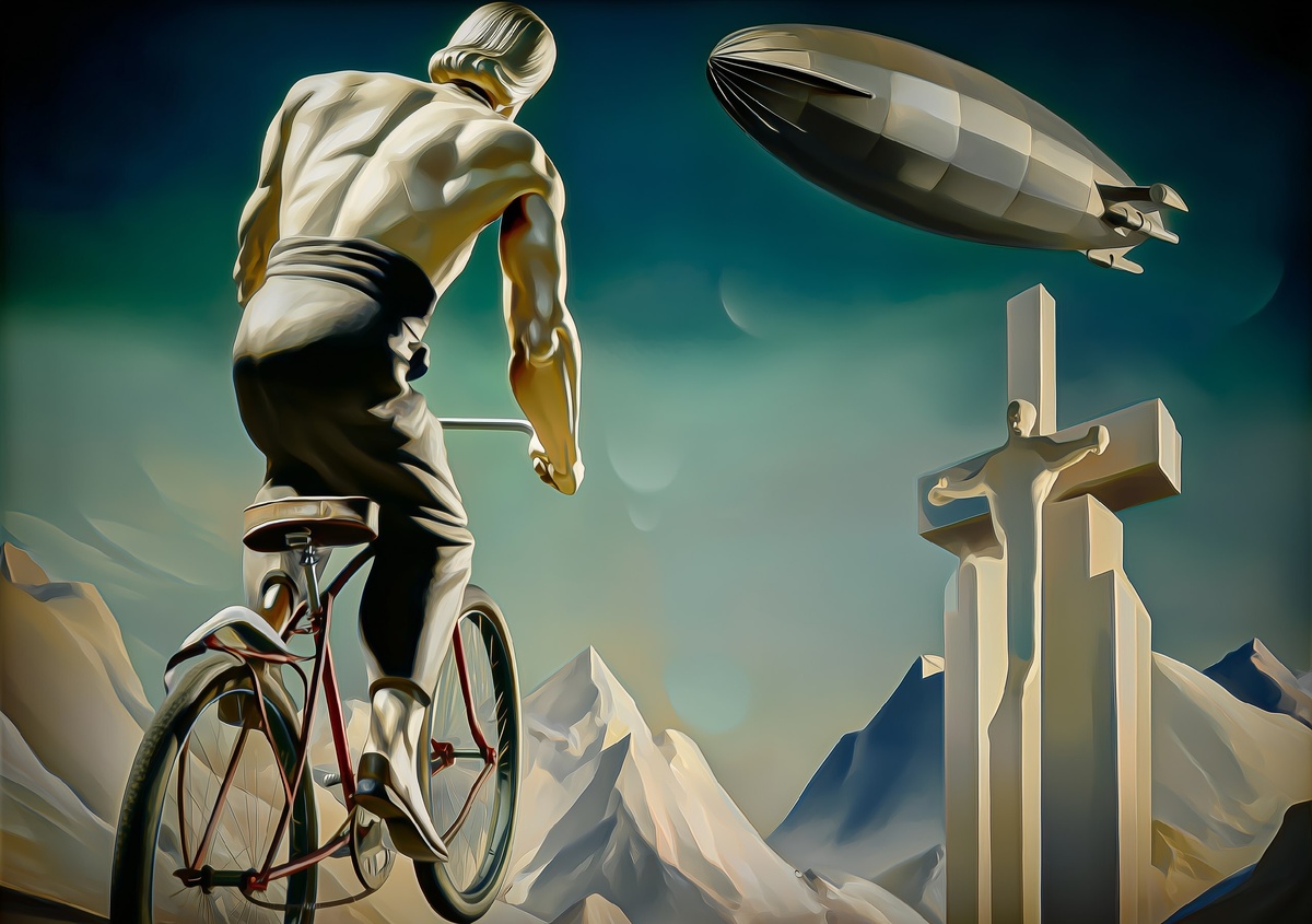 Создано на основе запроса: jesus christ bicycling on his tiny pennyfarth under the dark blimp nibiru ab a steep hill to hang on his neoncore