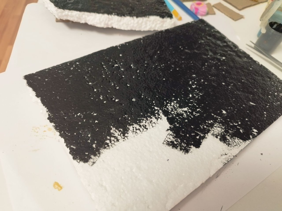 Клей-карандаш. Я взяла кусок пенопласта и аккуратно разрезала его пополам — эти две части станут основой композиции. Затем я слегка обломала края одной из половин, чтобы создать эффект разрушенной стены. После этого я покрыла поверхность пенопласта черной гуашью, придав ей необходимую глубину и выразительность. Однако местами я нарочно не прокрашивала тщательно. Из плотного картона я вырезала импровизированный обелиск, предварительно нарисовав его контуры. Однако изначально размер оказался меньше желаемого, но находчивость подсказала решение: я использовала этот элемент как основу, приклеив его к обелиску большего размера. Таким образом, конструкция приобрела объемность и выразительность. Завершающим штрихом стало покрытие обелиска золотистой краской. Из картона я сделала площадку для о
