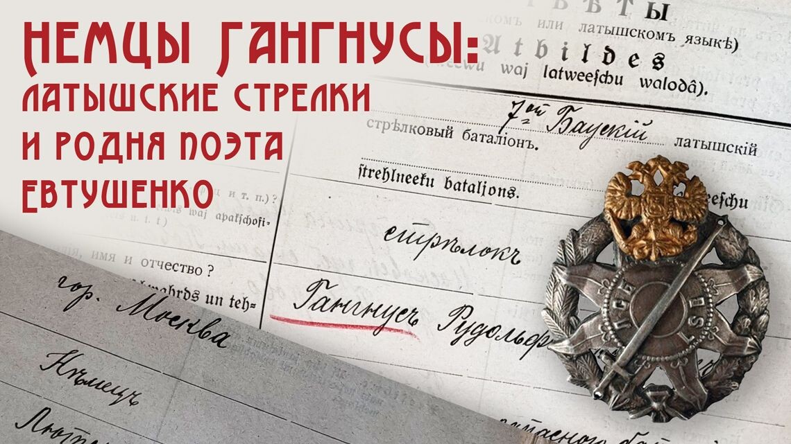Э нет, не латыши Гангнусы, которые были предками поэта. Немцы, хотя многие родом из современной Латвии. Об этом ему рассказал Густав Гангнус из Германии, который посвятил свою жизнь сбору сведений о фамилии. Поэтому уже в книге «Волчий паспорт» Евтушенко рассказал об этом и о своих подлинных корнях. Ну, а я могу теперь добавить, что некоторые из родственников поэта облатышились и побывали латышскими стрелками. И даже те оказались латышскими стрелками, кто оставался немцем по национальности.