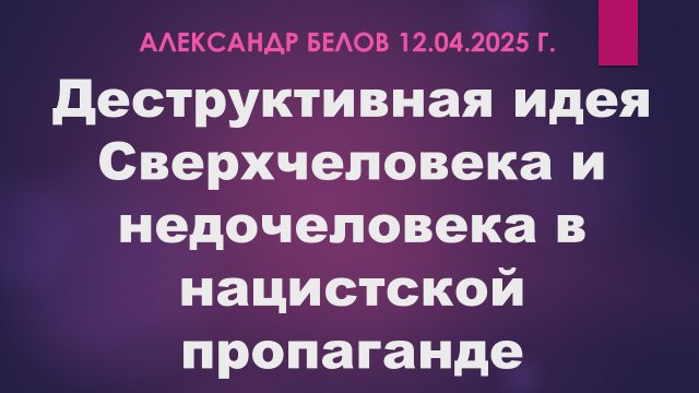 u Во времена Третьего Рейха нацистская пропаганда активно пропагандировала светлое будущее, но в него должны были попасть не все. Ожидался скорый приход Сверхчеловека (Уберменш). Эта концепция была выдвинута немецким философом Фридрихом Ницше в своем произведении «Так говорил Заратустра» 1883-85 гг. Он писал, опираясь на концепцию Ч. Дарвина, что современный человек является «переходным звеном» между обезьяной и Сверхчеловеком будущего.