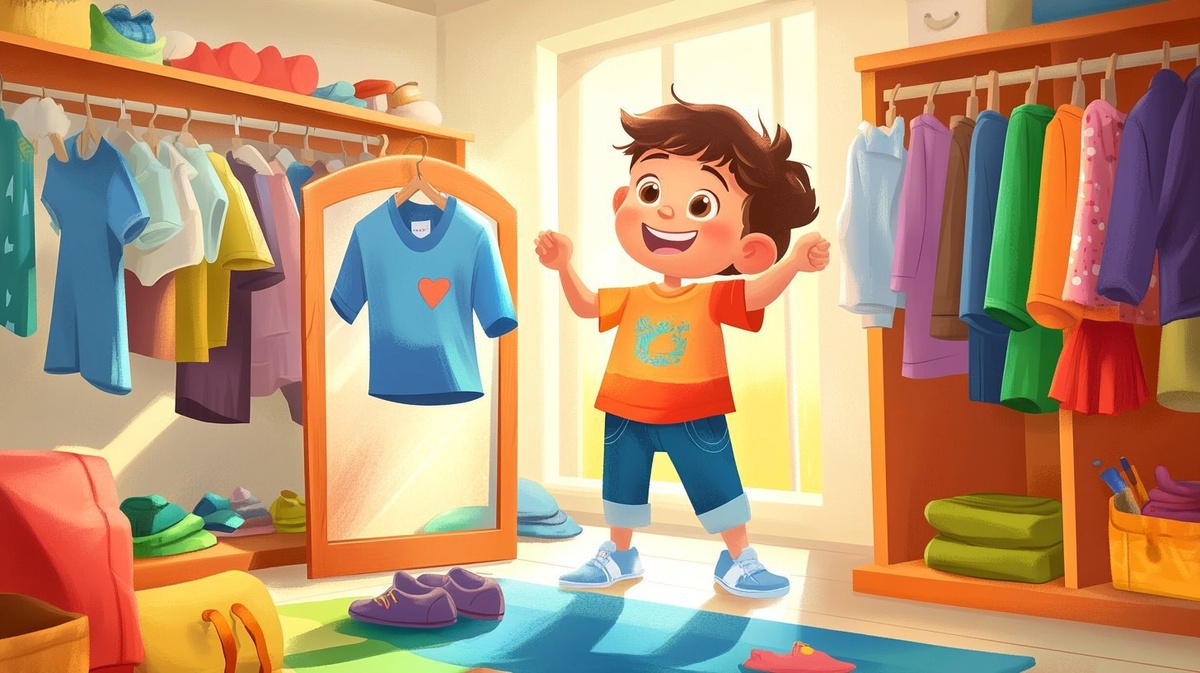 Создано на основе запроса: a joyful cartoon child in a sunny bedroom, trying on clothes in front of a mirror socks, shirt, pants, etc., clothes scattered neatly around, wardrobe open with colorful outfits, the child smiling and proud of getting dressed alone, gender-neutral, warm soft colors, educational and supportive theme for kids under 8