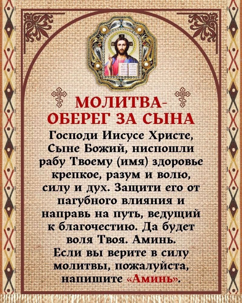 МОЛИТВА-ОБЕРЕГ ЗА СЫНА Господи Иисусе Христе, Сыне Божий, ниспошли рабу Твоему (имя) здоровье крепкое, разум и волю, силу и дух. Защити его от пагубного влияния и направь на путь, ведущий к благочестию. Да будет воля Твоя. Аминь.