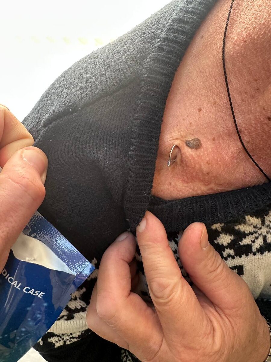 Это не пирсинг !!!! В анамнезе перелом ключицы, фиксация проволокой, которая теперь мешает сделать мрт, пациент так ходит не первую пятилетку.